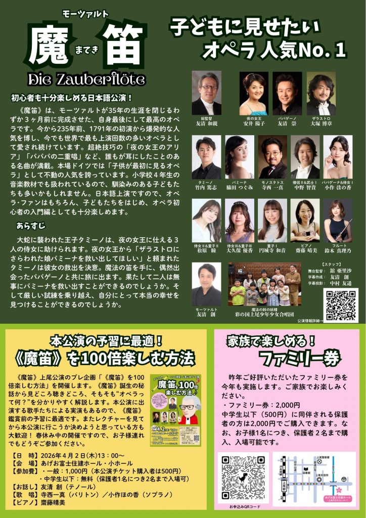 | 出演者 | 総監督 :友清和親 夜の女王 :安井陽子 パパゲーノ :友清 崇 ザラストロ :大塚博章 タミーノ :竹内篤志 パミーナ :脇田つぐみ モノスタトス:寺西一真 パパゲーナ :小作ほの香 僧侶、武士 :中野智貴 侍女、童子 :松原 瞳/大久保優香/円城寺和音 ピアノ :齋藤晴美 フルート :鈴木真理乃 魔法の鈴の妖精:彩の国上尾少年少女合唱団 モーツァルト :友清 創 |